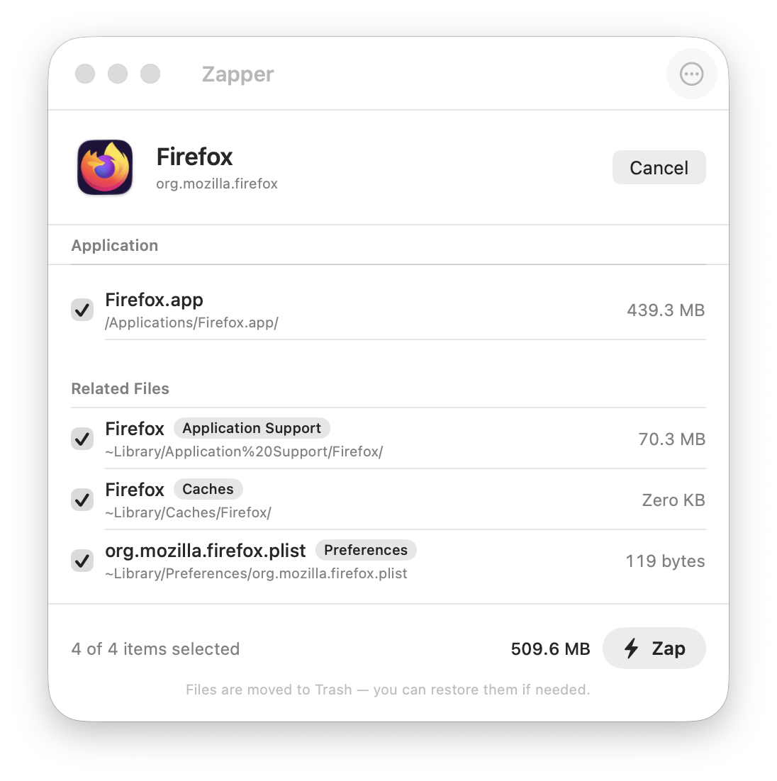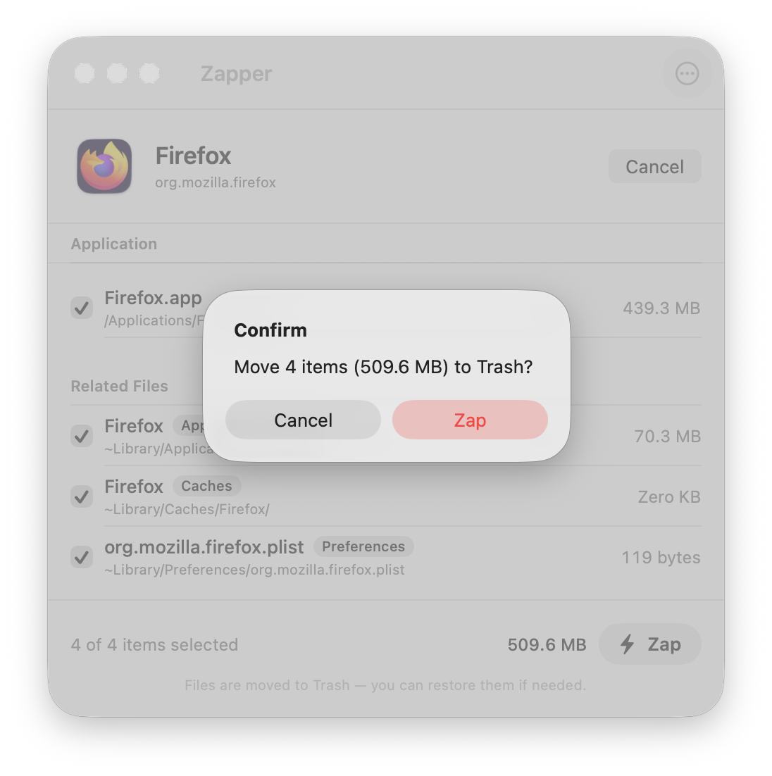 Zapper is a macOS app uninstaller that removes every file left behind when you delete an application. When you drag a Mac app to Trash, macOS only removes the .app bundle — hundreds of hidden files in ~/Library persist. Zapper scans 11 Library directories in parallel, using word-boundary matching to find every related file without false positives.